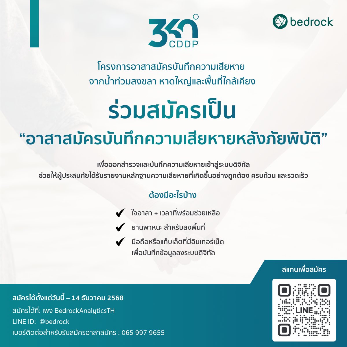 เบดร็อค อนาไลติกส์ ผู้พัฒนาโครงสร้างพื้นฐานด้านข้อมูลและเทคโนโลยีสำหรับเมืองอัจฉริยะ ได้เปิดตัว “แพลตฟอร์มดิจิทัลข้อมูลเมือง เพื่อการเก็บหลักฐานทางสาธารณภัยแบบ 360° (CDDP360)” แพลตฟอร์มบันทึกหลักฐานความเสียหายหลังภัยพิบัติในรูปแบบดิจิทัล ที่ถูกออกแบบมาเพื่อช่วยให้ผู้ประสบภัยในหาดใหญ่ – สงขลา ใช้เก็บข้อมูลความเสียหายได้ง่ายขึ้น แม่นยำขึ้น มั่นใจว่าข้อมูลได้รับการคุ้มครองตาม พ.ร.บ.คุ้มครองข้อมูลส่วนบุคคล และทั้งหมดนี้ใช้งานได้ฟรี ไม่มีค่าใช้จ่าย