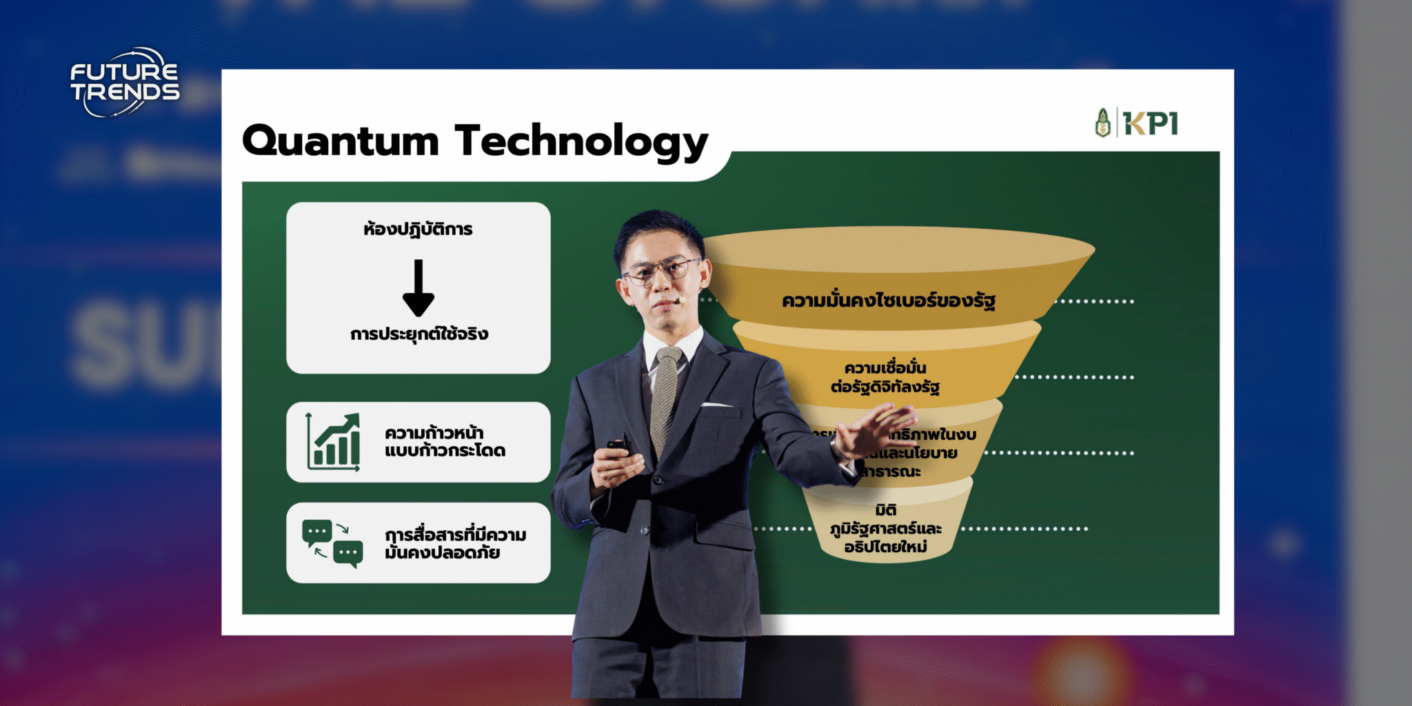 การเติบโตของสิทธิบัตรด้าน Quantum เพิ่มขึ้นถึง 7 เท่าในรอบ 10 ปี ซึ่งเทคโนโลยีนี้จะเป็น ‘Black Swan’ หรือหงส์ดำที่เข้ามาพลิกโฉมทุกวงการ ทั้งการเจาะระบบ Cybersecurity ของรัฐ ความเชื่อมั่นในธุรกรรมดิจิทัล และภูมิรัฐศาสตร์โลก หากใครตกขบวนรถไฟขบวนนี้ อาจสูญเสียอำนาจอธิปไตยทางเทคโนโลยีไปอย่างถาวร