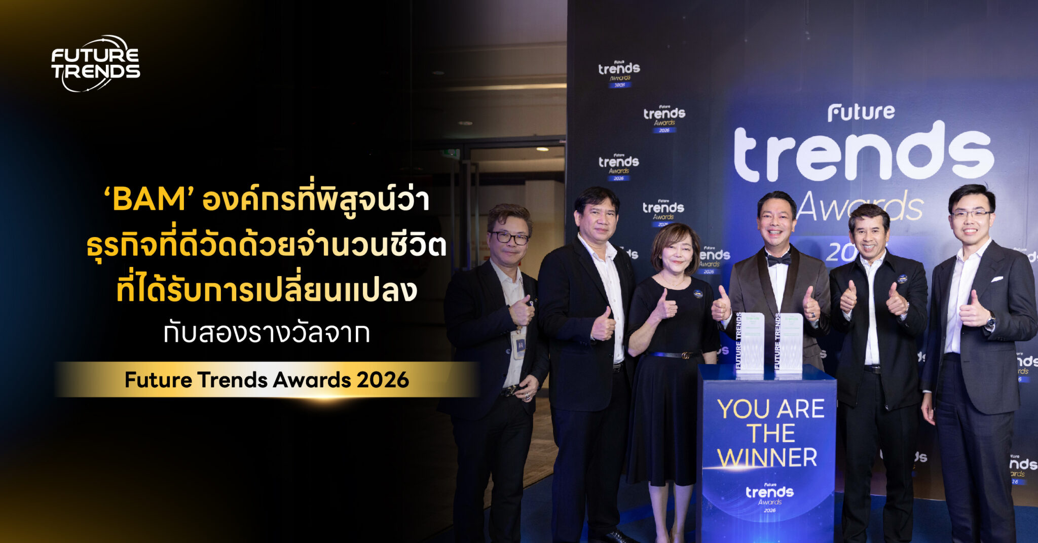 Future Trends Awards 2026 มอบรางวัล Leading of Social Product Award และ Leading of Governance Award ให้กับ BAM เพราะองค์กรแห่งนี้กำลังพิสูจน์ว่า ธุรกิจที่ดีไม่ได้วัดแค่ผลกำไร แต่วัดด้วยจำนวนชีวิตที่ได้รับการเปลี่ยนแปลง