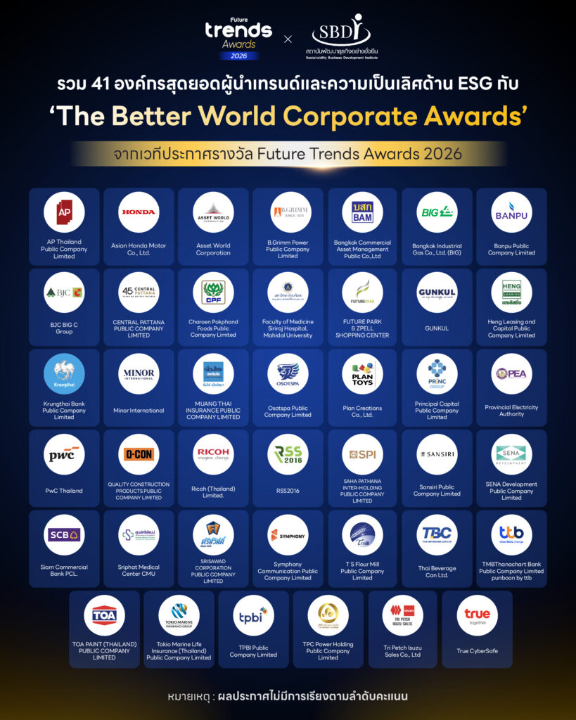 และนี่คือรายชื่อ 41 องค์กรที่ได้รับรางวัล ‘The Future Corporate Awards’ จากเวที Future Trends Awards 2026 (ไม่มีการเรียงตามลำดับคะแนน)