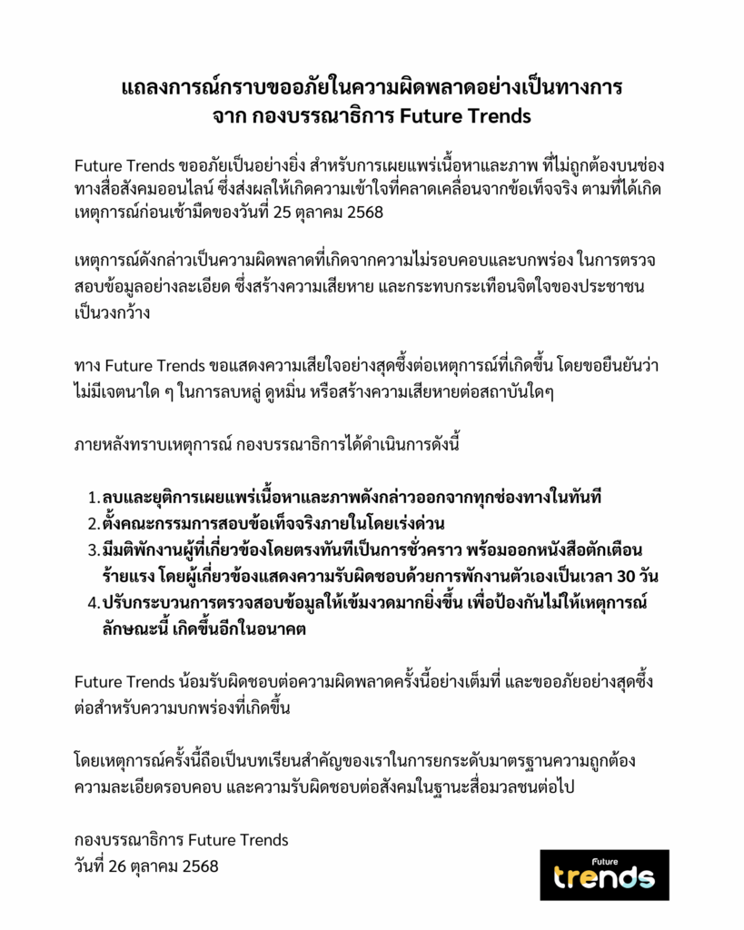 Future Trends ขออภัยเป็นอย่างยิ่ง สำหรับการเผยแพร่เนื้อหาและภาพ ที่ไม่ถูกต้องบนช่องทางสื่อสังคมออนไลน์ ซึ่งส่งผลให้เกิดความเข้าใจที่คลาดเคลื่อนจากข้อเท็จจริง ตามที่ได้เกิดเหตุการณ์ก่อนเช้ามืดของวันที่ 25 ตุลาคม 2568