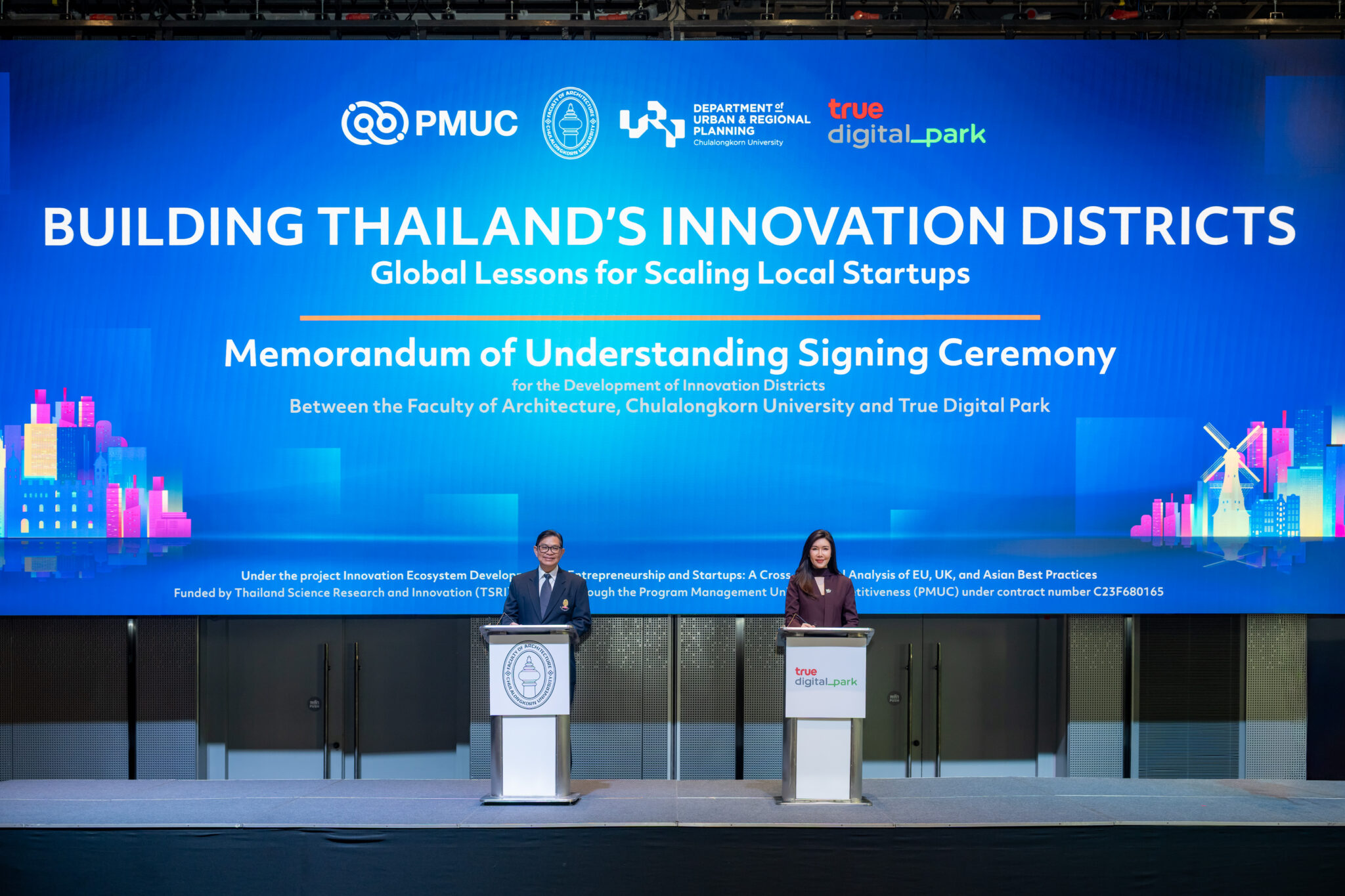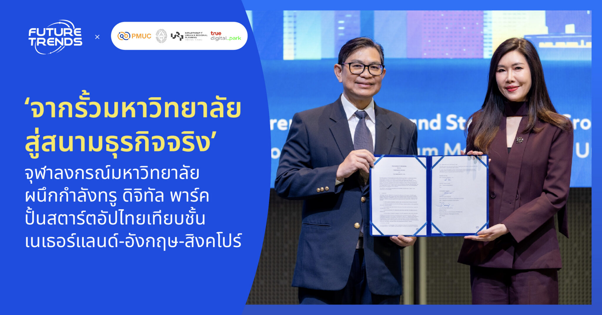 จุฬาลงกรณ์มหาวิทยาลัย โดยคณะสถาปัตยกรรมศาสตร์ และ ศูนย์บริการวิชาการแห่งจุฬาลงกรณ์มหาวิทยาลัย ลงนามบันทึกข้อตกลงความร่วมมือ (MOU) กับ ทรู ดิจิทัล พาร์ค ผนึกกำลังขับเคลื่อนโครงการ ‘การพัฒนาย่านนวัตกรรมสนับสนุนผู้ประกอบการสตาร์ตอัป ผ่านการเรียนรู้โมเดลระดับโลก’ เพื่อเปลี่ยนงานวิจัยระดับมหาวิทยาลัยให้กลายเป็นธุรกิจที่เติบโตได้จริงในระดับสากล